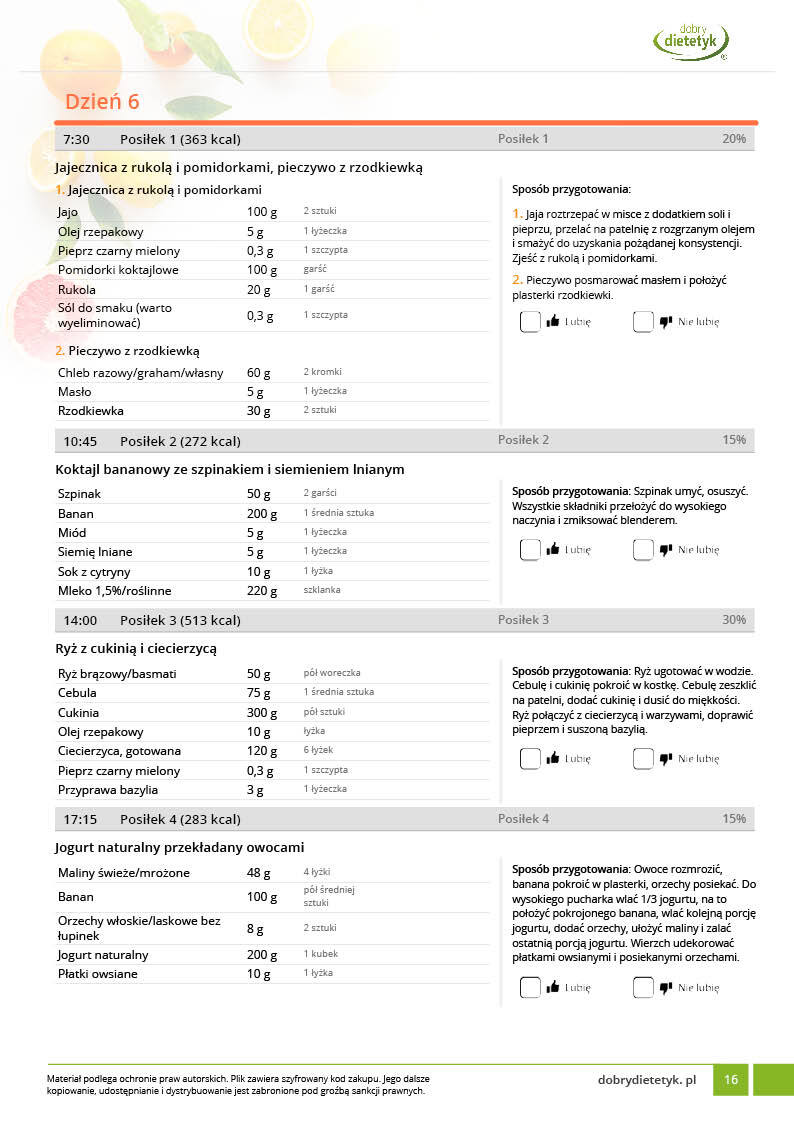 w formie propozycji posiłków (zamiast pojedynczych jadłospisów jednodniowych, przygotowano propozycje kilku propozycji dań na każdy posiłek). Tutaj nie uzależniamy Cię od tego jakie masz np. w danym dniu zjeść śniadanie czy obiad, tylko sam wybierasz sobie ulubione danie z kilku przedstawionych przez nas propozycji.
