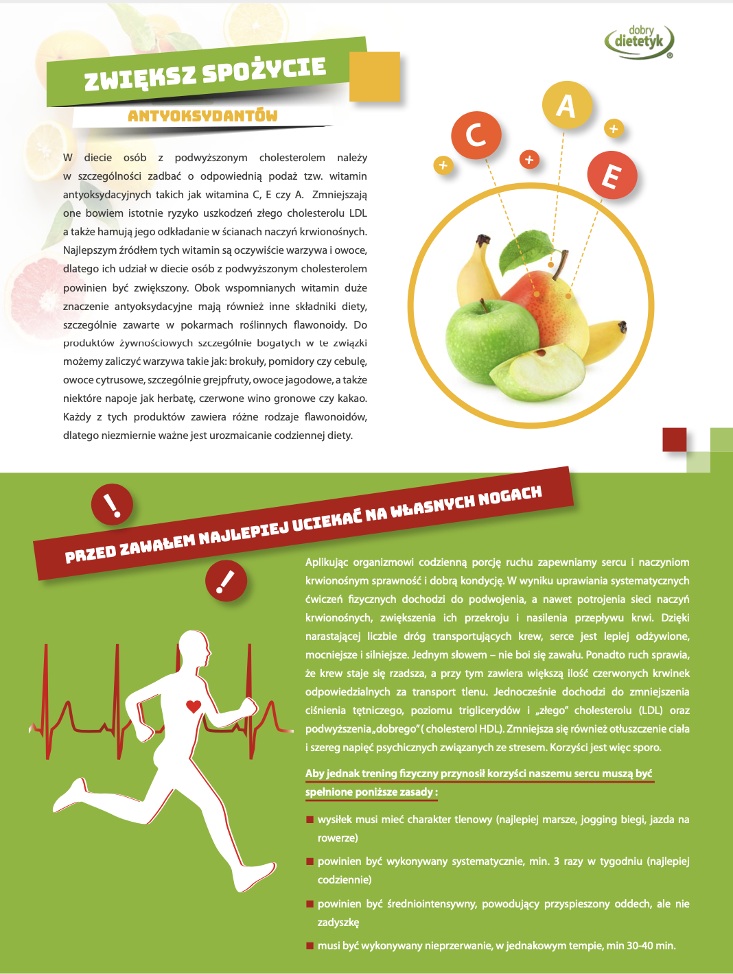 Kompleksowy program żywieniowy dla mężczyzn, który w naturalny sposób pomaga obniżać poziom cholesterolu we krwi. Specjalnie opracowana 30-dniowa dieta obok korzystnego wpływu na cholesterol, funkcjonowanie serca i układu krążenia działa także korzystnie na redukcję zbędnej masy ciała. W jej składzie zadbano w szczególności o składniki normalizujące gospodarkę tłuszczową organizmu a także witaminy antyoksydacyjne chroniące przed rozwojem zmian miażdżycowych. Dieta sprawdza się dodatkowo u mężczyzn u których stwierdzono także inne nieprawidłowości w obrazie krwi, jak podwyższony cukier, trójglicerydy czy badania wątrobowe.