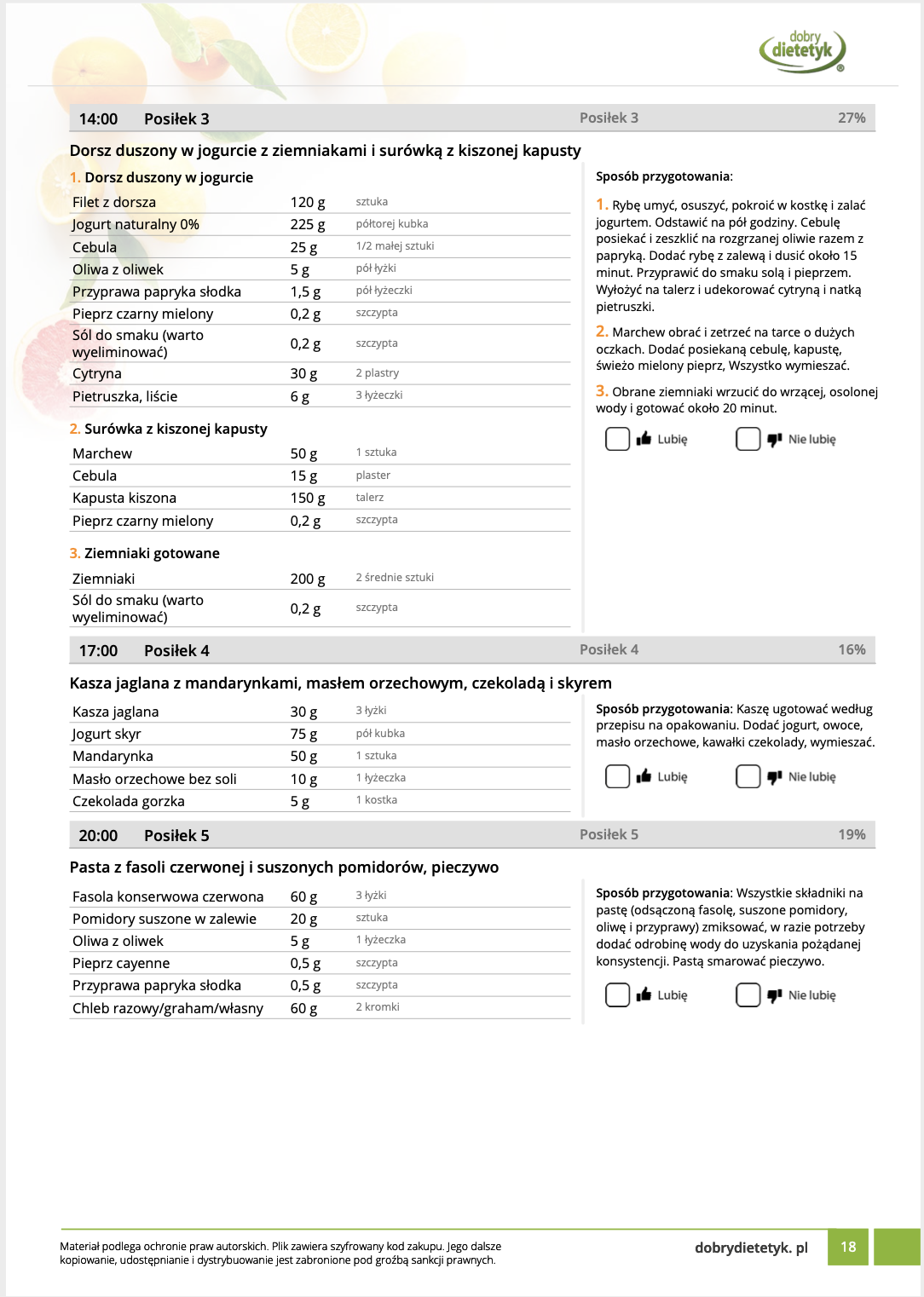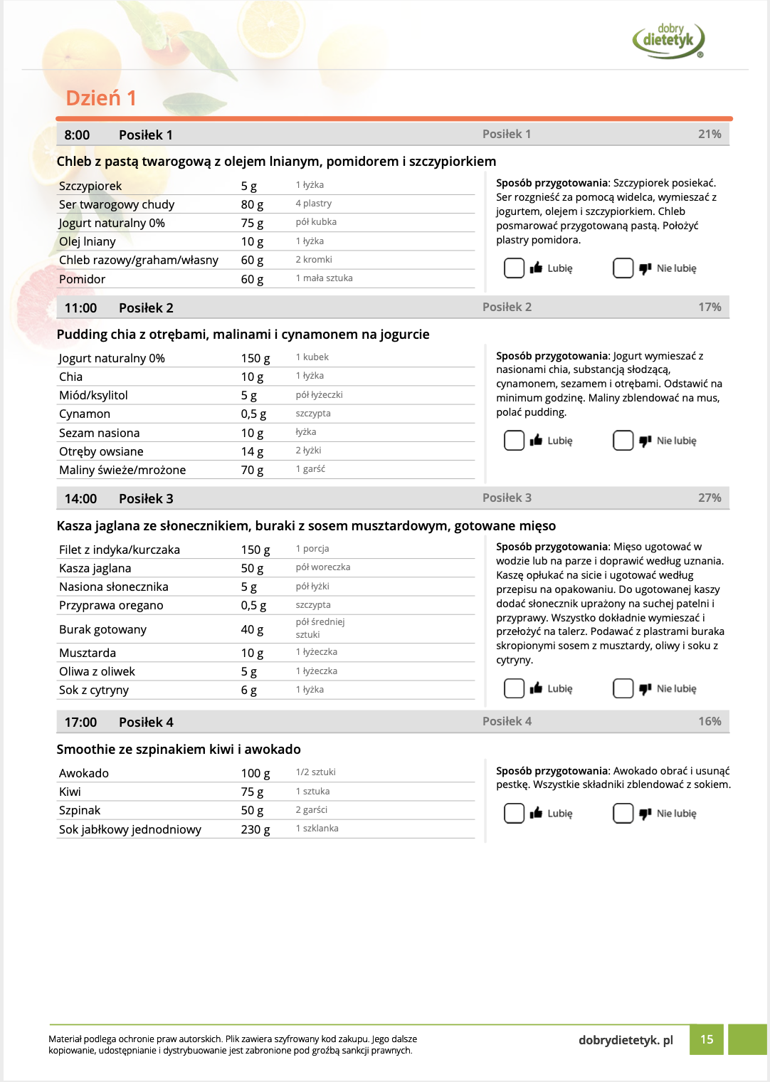 • w formie propozycji posiłków (zamiast pojedynczych jadłospisów jednodniowych, przygotowano propozycje kilku propozycji dań na każdy posiłek). Tutaj nie uzależniamy Cię od tego jakie masz np. w danym dniu zjeść śniadanie czy obiad, tylko sam wybierasz sobie ulubione danie z kilku przedstawionych przez nas propozycji.