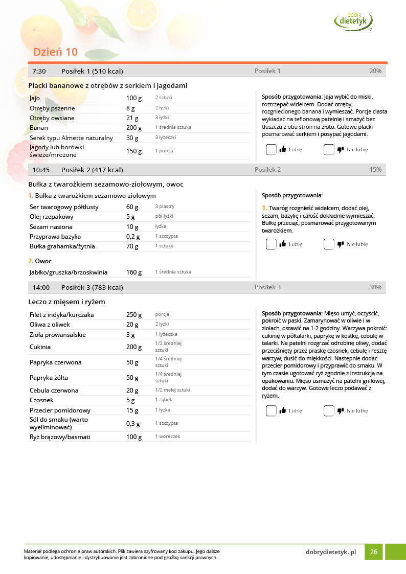 w formie propozycji posiłków (zamiast pojedynczych jadłospisów jednodniowych, przygotowano propozycje kilku propozycji dań na każdy posiłek). Tutaj nie uzależniamy Cię od tego jakie masz np. w danym dniu zjeść śniadanie czy obiad, tylko sam wybierasz sobie ulubione danie z kilku przedstawionych przez nas propozycji.